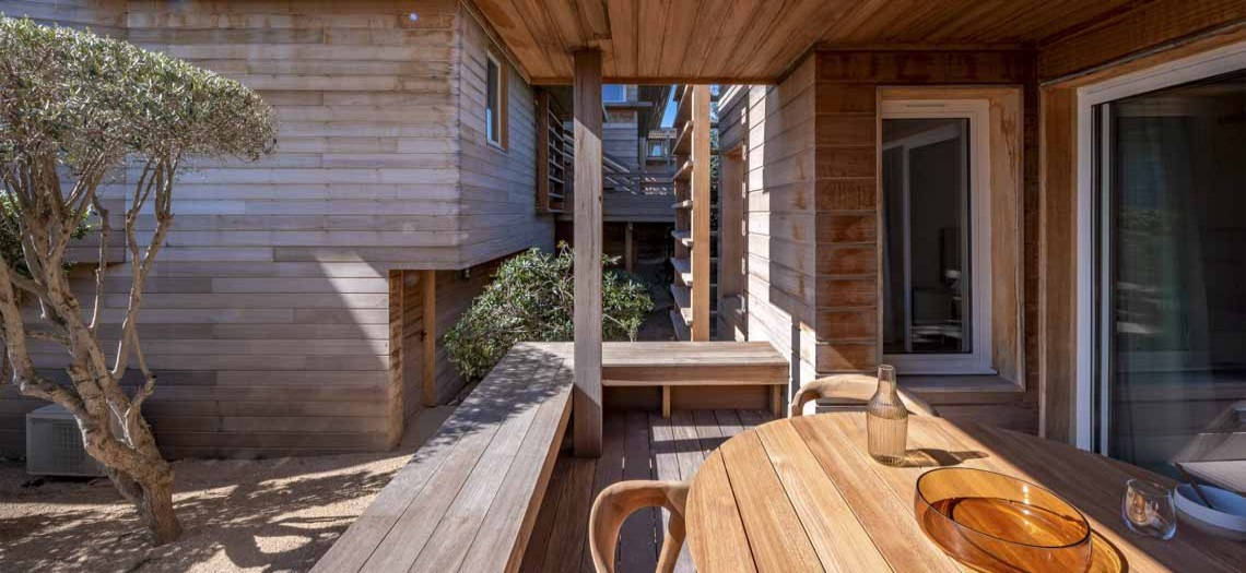 As throughout the Domaine, wood predominates here too, on the exteriors and terraces, adding a warm, natural touch to the environment.