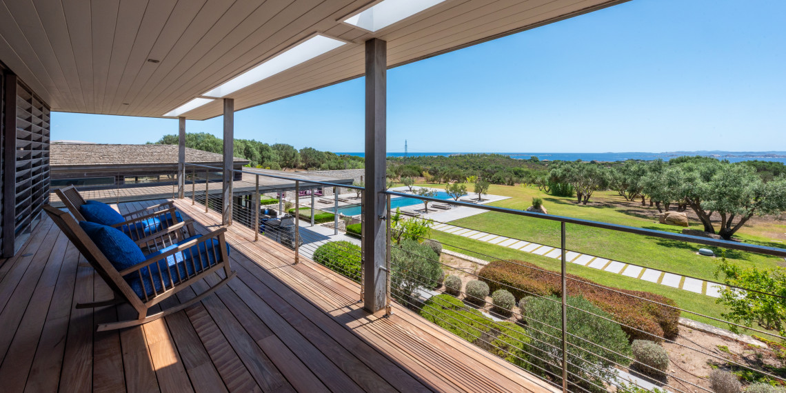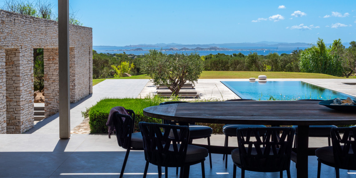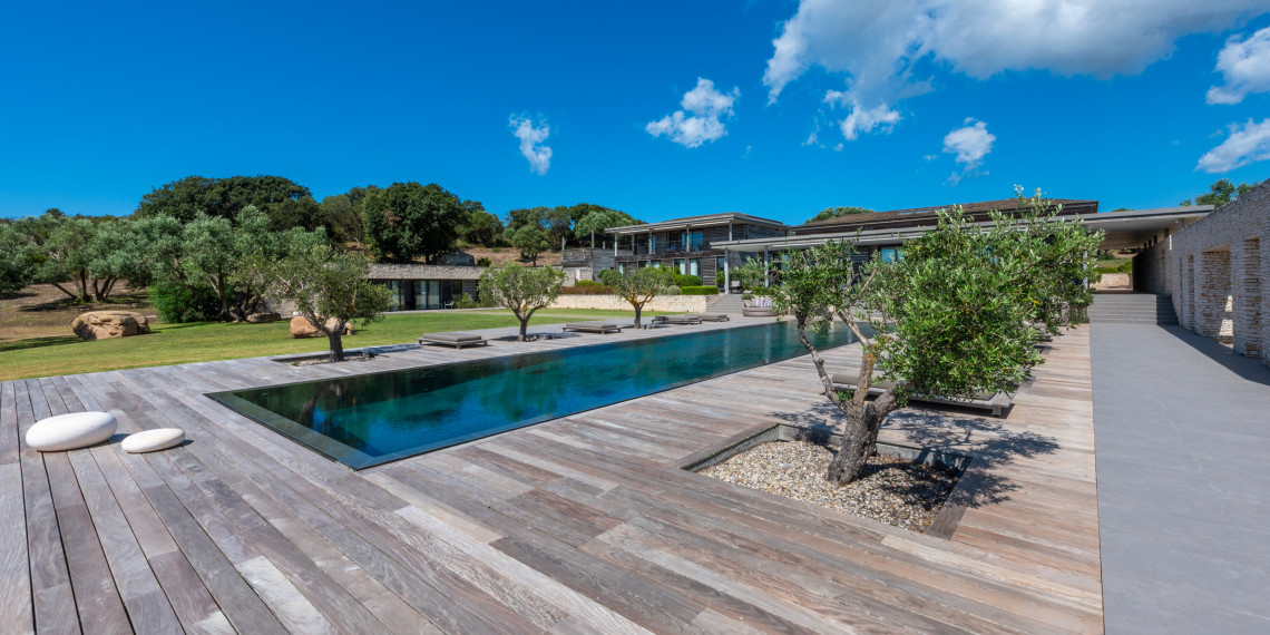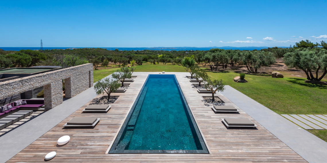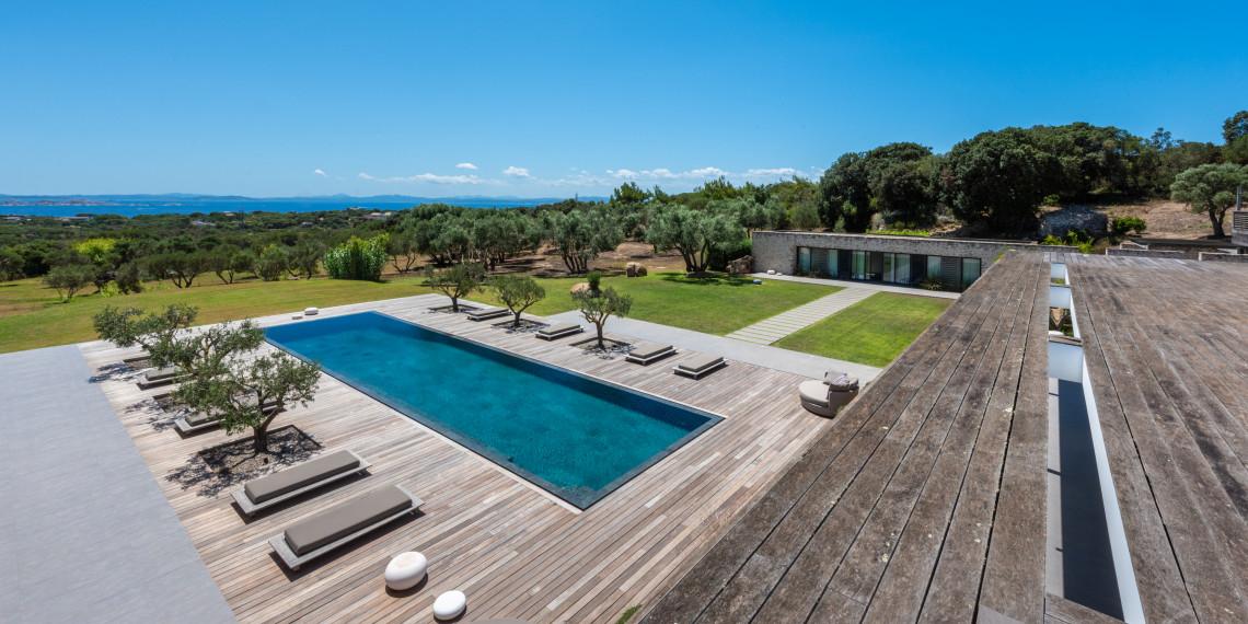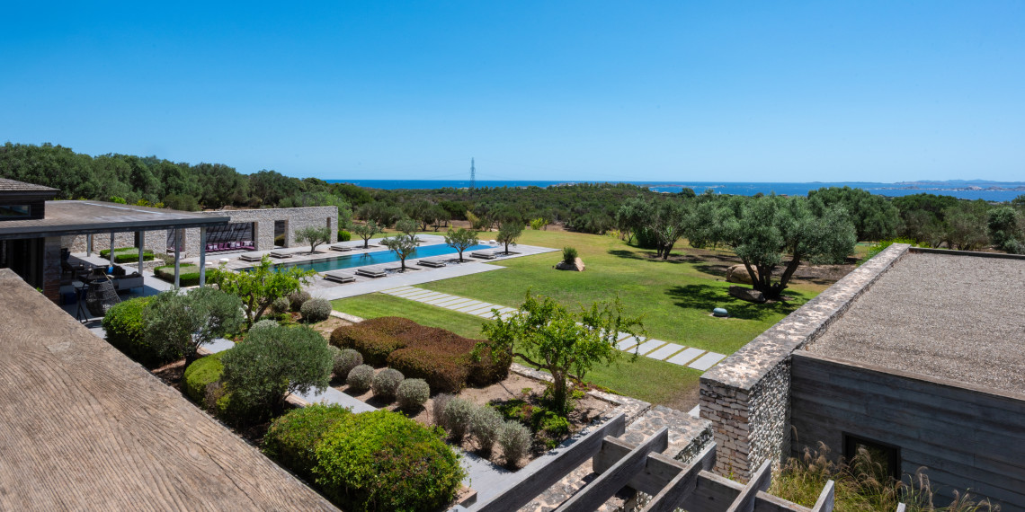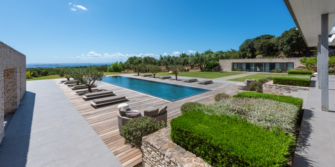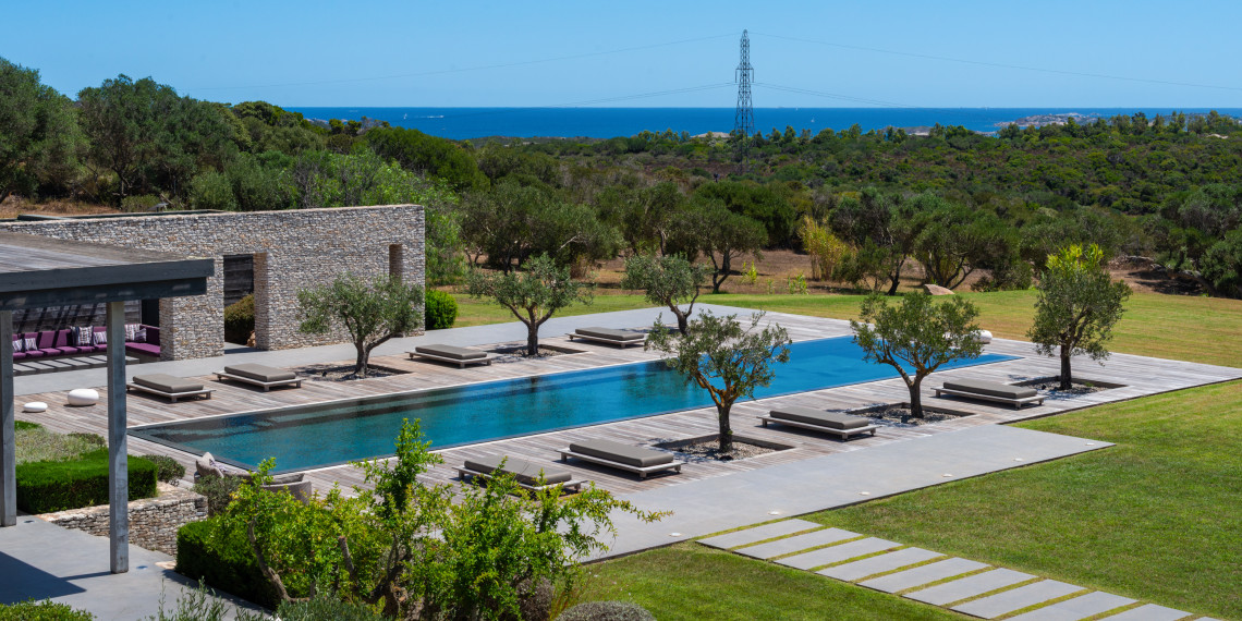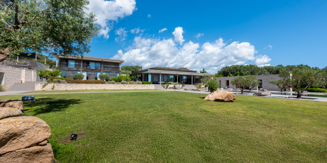 Dans un parc d'oliviers de 2 hectares, à proximité du Golf de Sperone, sa situation en retrait du littoral, profite d’ une vue panoramique sur les îles Lavezzi, Cavallo et l’archipel sarde. Les espaces extérieurs ont été soignés avec la mise en valeur d’une oliveraie centenaire qui entoure la bâtisse.