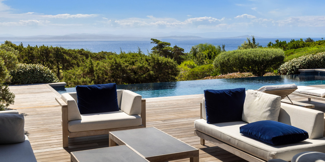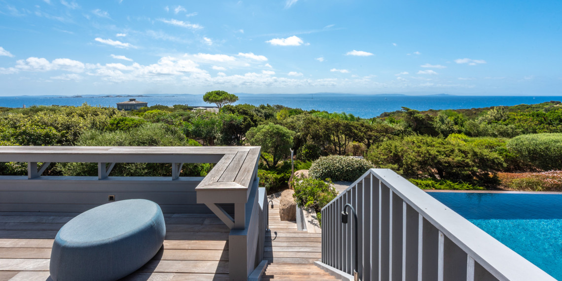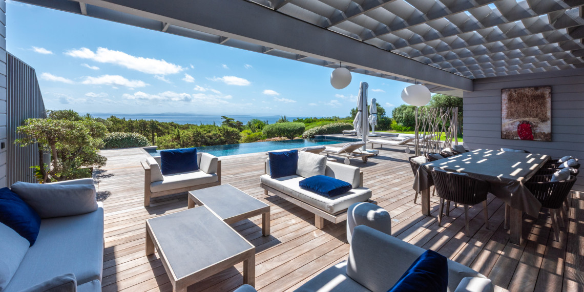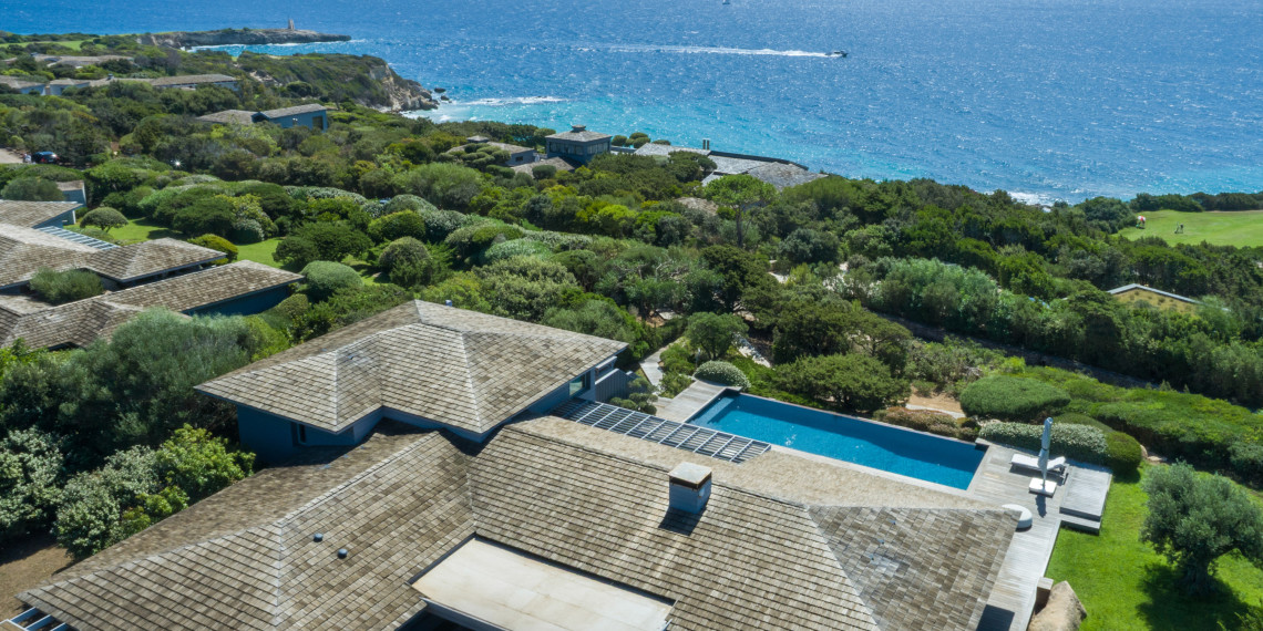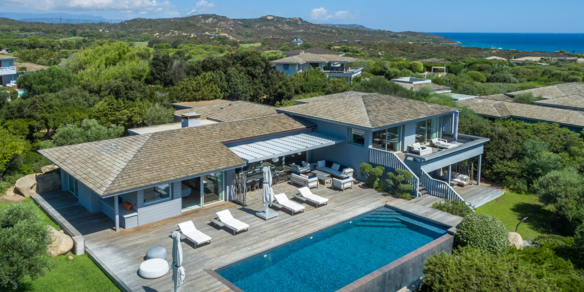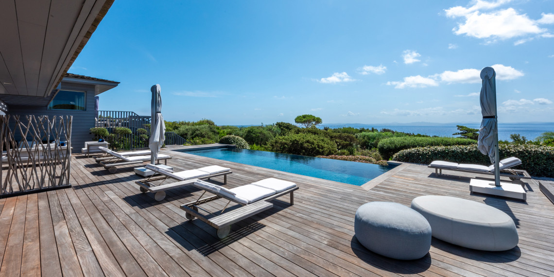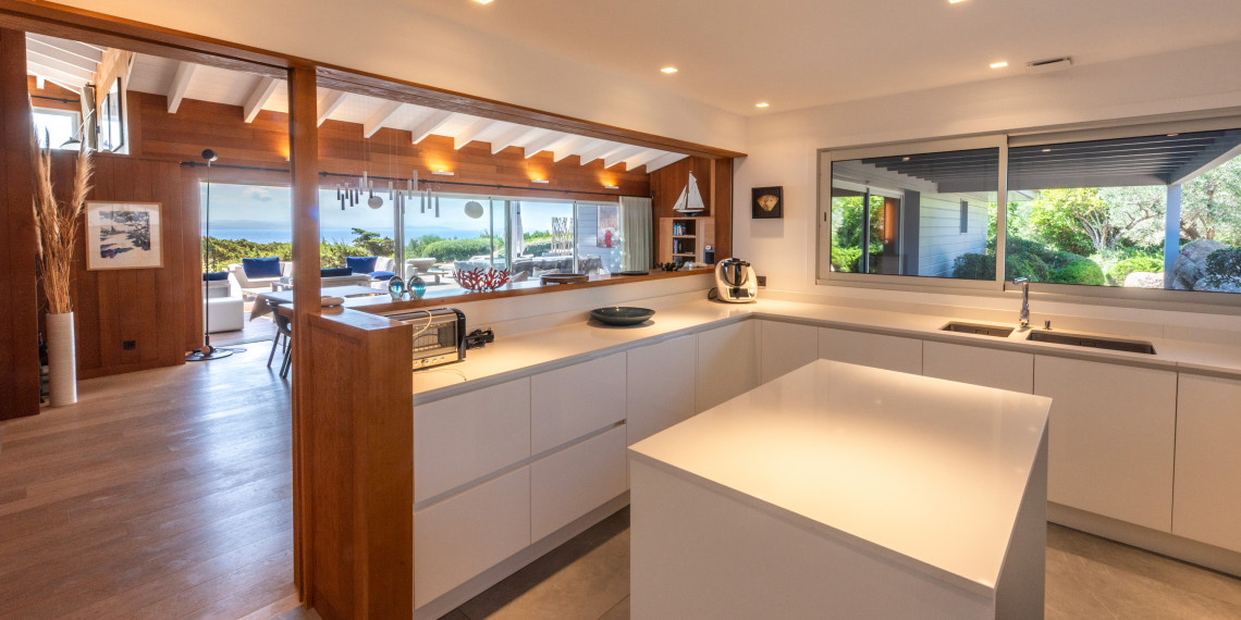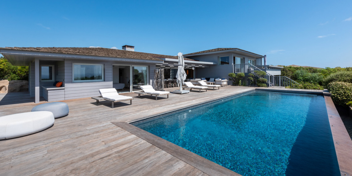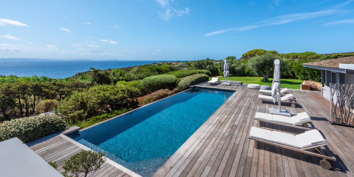 Sur 3 demi-niveaux, la villa épouse le terrain de façon agréable pour profiter dans chacun de ses espaces d'une vue mer ou végétale. De grandes terrasses encadrent la piscine à débordement. Cet ensemble atteint un équilibre parfait par les choix des matériaux de premier ordre effectué et une décoration particulièrement douce et raffinée. La vue mer sur les Bouches de Bonifacio est particulièrement prenante, la Sardaigne se détache sur l'horizon ainsi que les îles Lavezzi sur la partie Est.