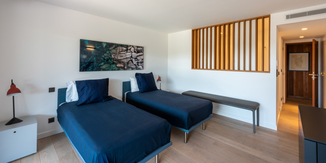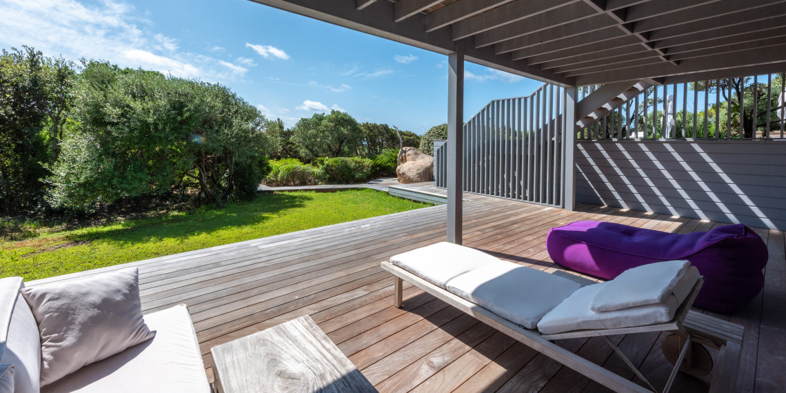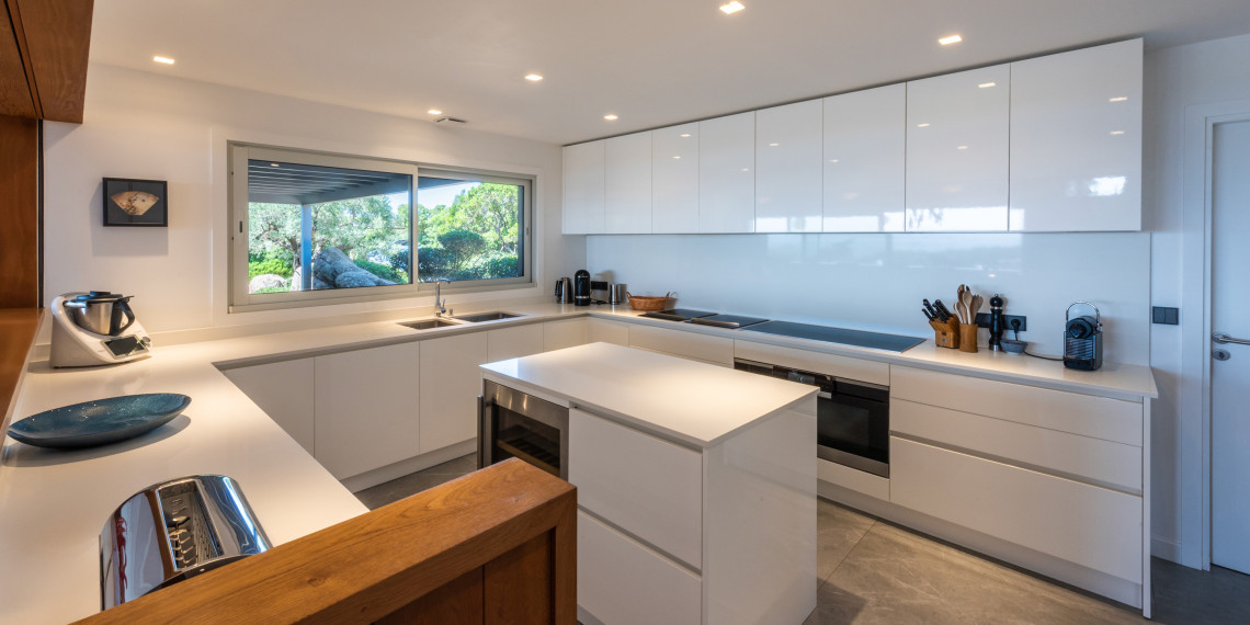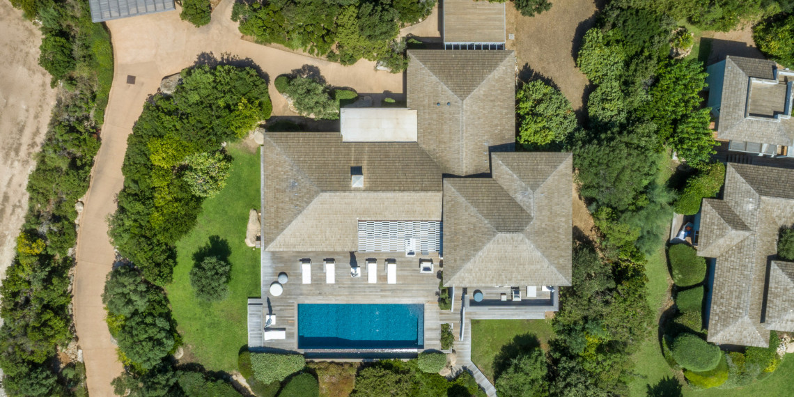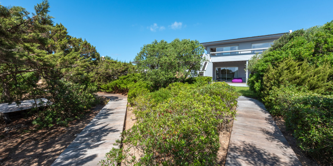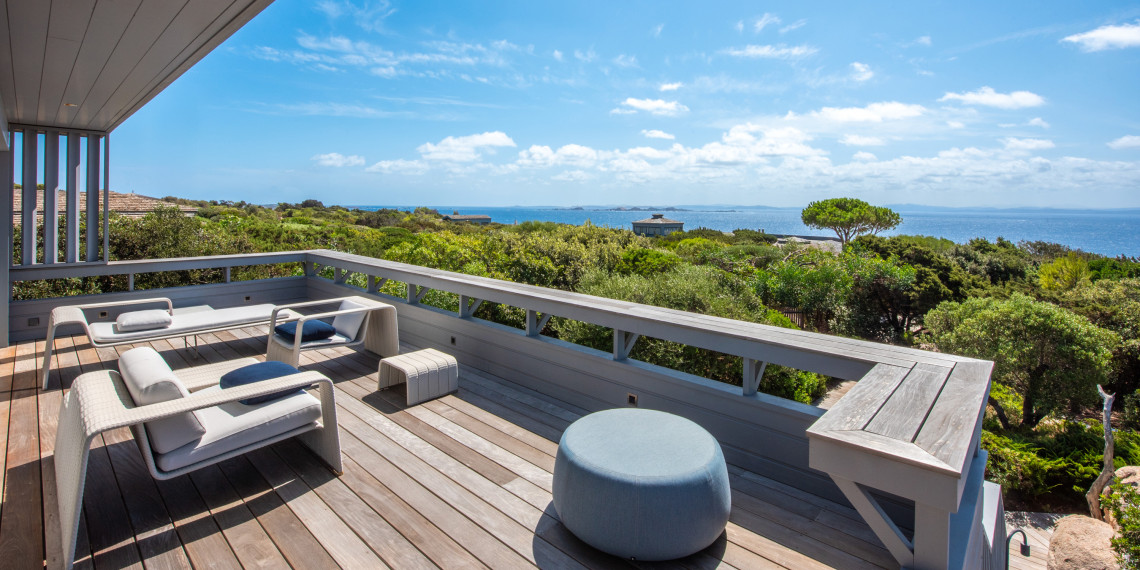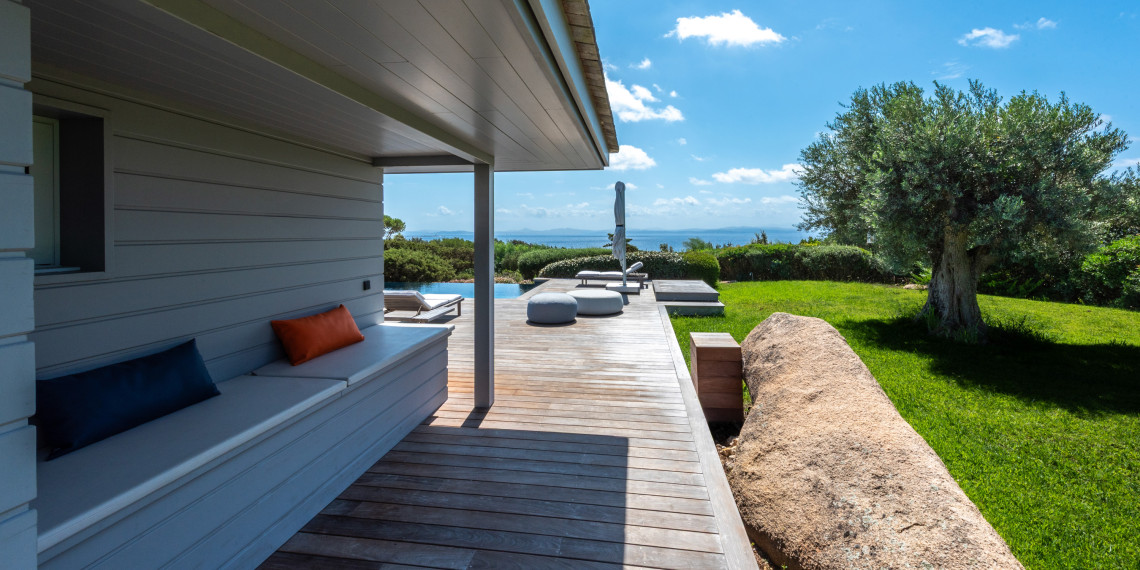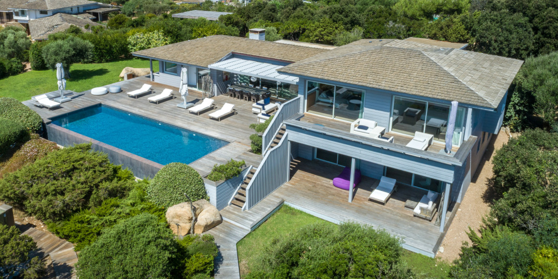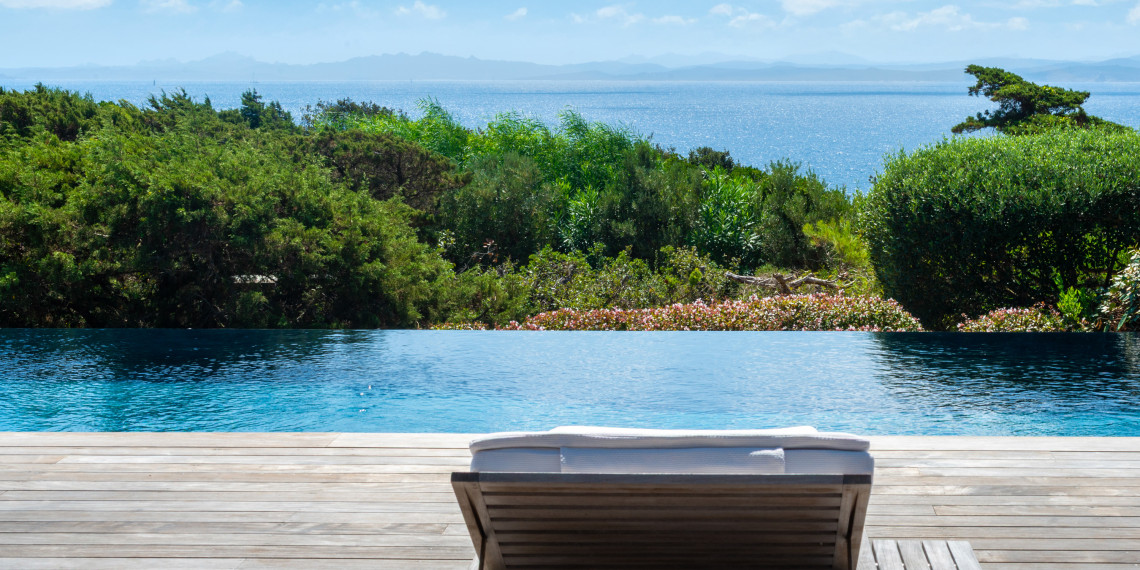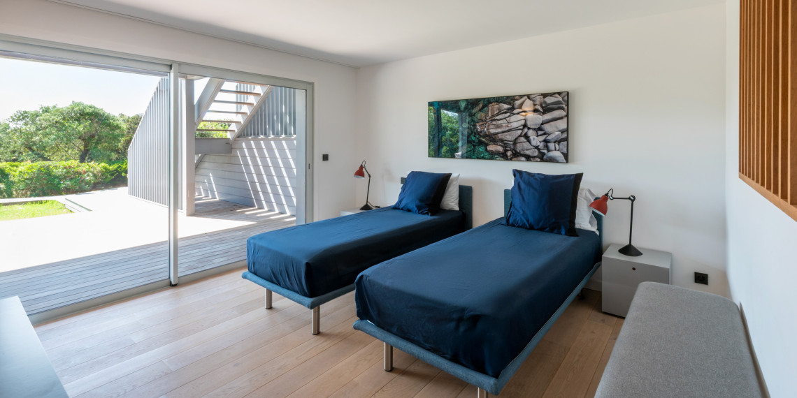 Sur 3 demi-niveaux, la villa épouse le terrain de façon agréable pour profiter dans chacun de ses espaces d'une vue mer ou végétale. De grandes terrasses encadrent la piscine à débordement. Cet ensemble atteint un équilibre parfait par les choix des matériaux de premier ordre effectué et une décoration particulièrement douce et raffinée. La vue mer sur les Bouches de Bonifacio est particulièrement prenante, la Sardaigne se détache sur l'horizon ainsi que les îles Lavezzi sur la partie Est.