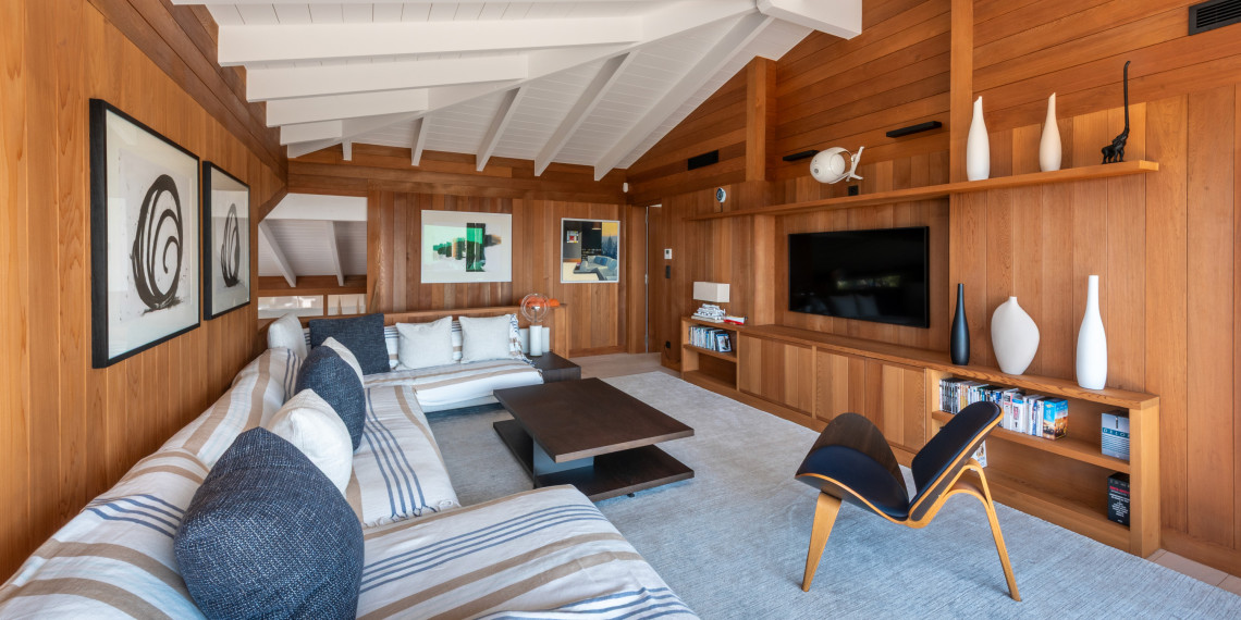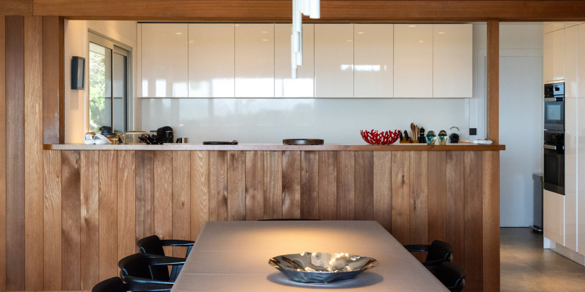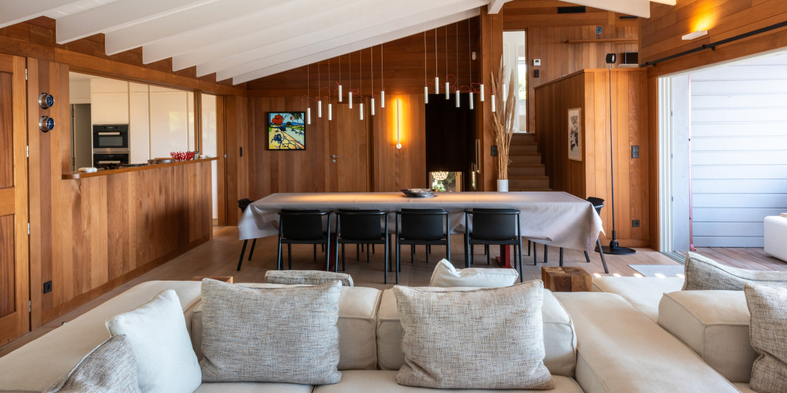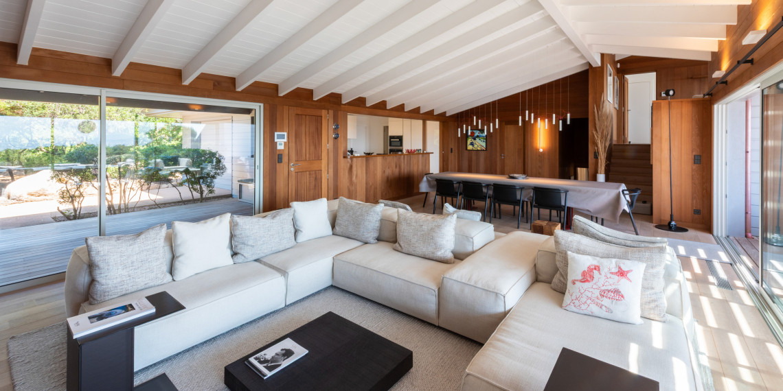 En hauteur de la deuxième ligne du lotissement des Hauts de Sperone, cette villa récemment édifiée offre la quintessence du concept architectural des maisons de bois de Sperone dans une dimension maitrisée.